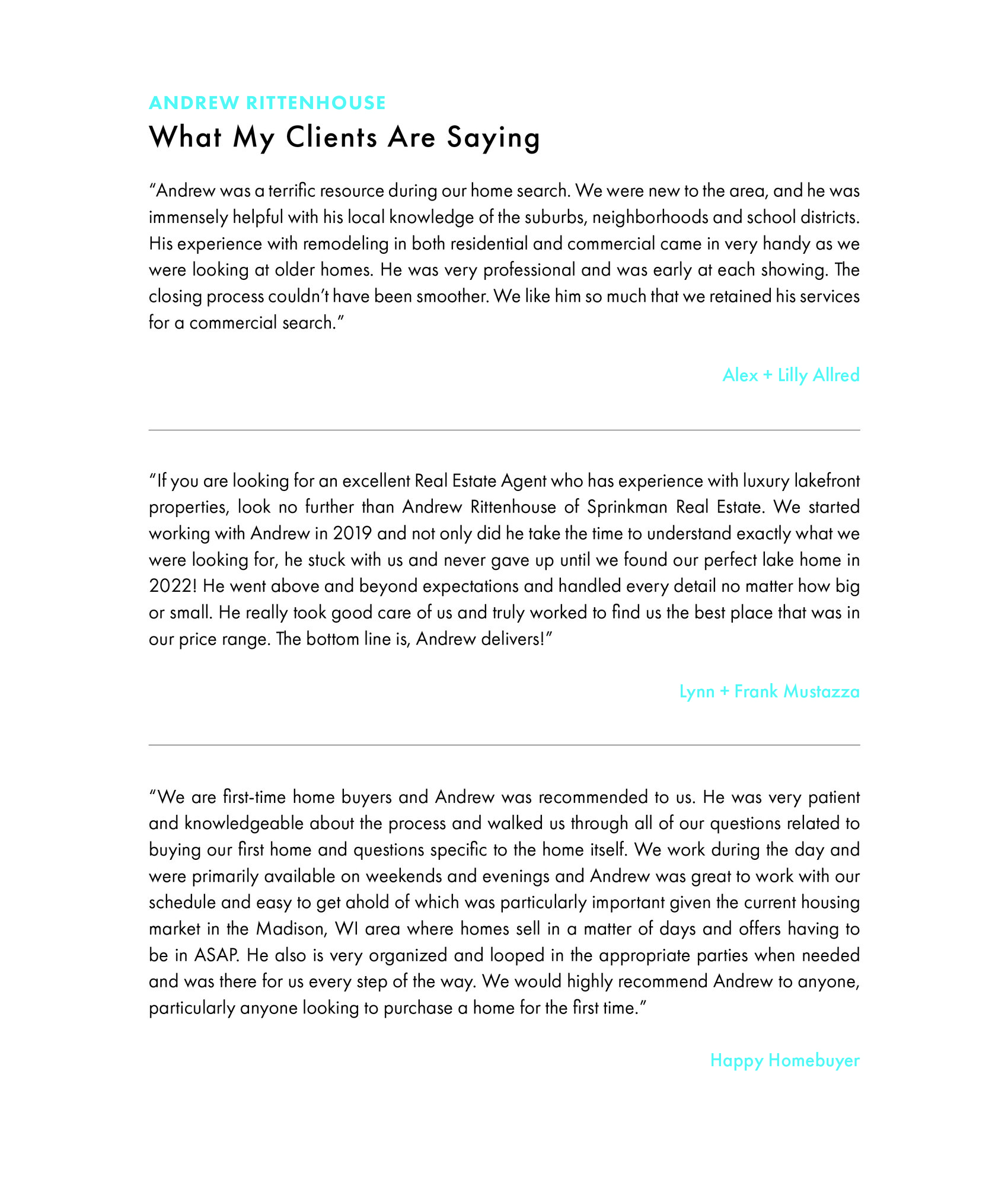 Andrew Rittenhouse grew up in Fort Wayne, Indiana renovating 100+ year old buildings with his dad and five younger brothers. After college, Andrew worked for several years in the accounting industry rising to the level of Controller, before pursuing his true passion for finding and revitalizing older homes. This led to the startup of successful real estate investing and home renovation businesses that operate in Wisconsin and Michigan. Andrew’s eye for finding homes with good value combined with extensive experience with home buying and selling across the Midwest ensures that his clients get the most out of the home buying and selling processes and are deeply satisfied with the outcome. Andrew is a Waunakee resident where he lives with his wife and two boys. Andrew enjoys spending his free time with family, woodworking, relaxing lake-side, and hiking the beautiful parks of Southern Wisconsin.